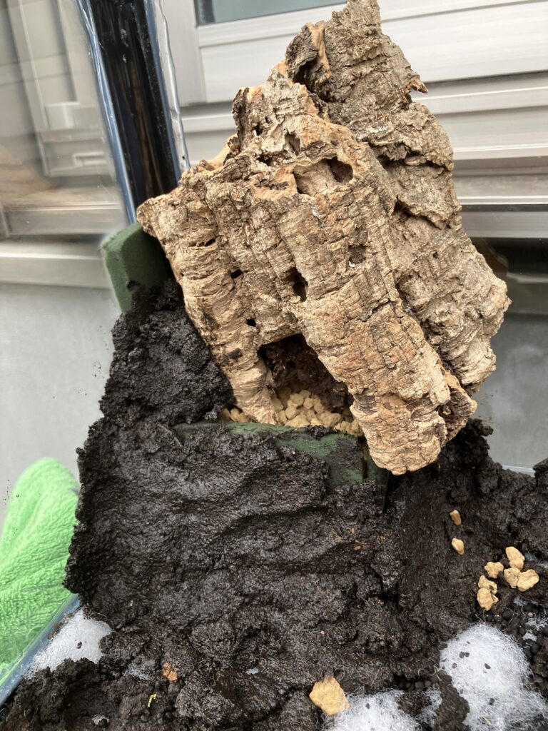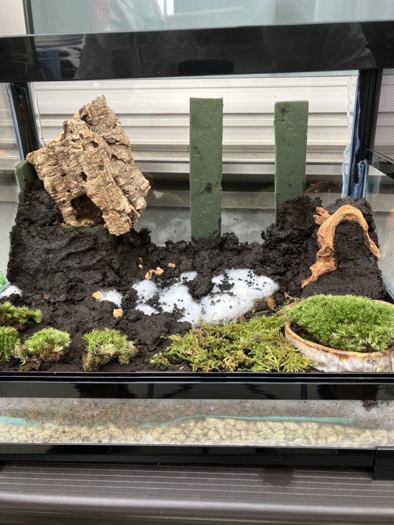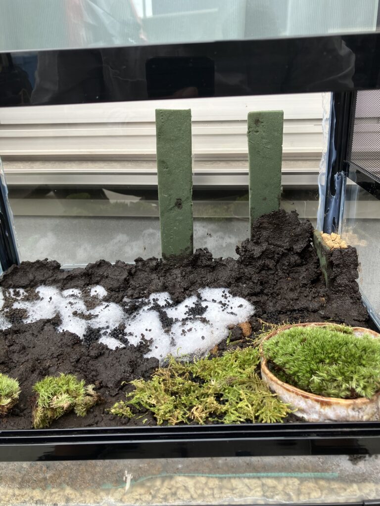 造形土で造形していきます!壁面や高さがある場所は水が回らないのでオアシスや赤玉土を設置して水分確保をしないなと乾いて植物が育ちません。